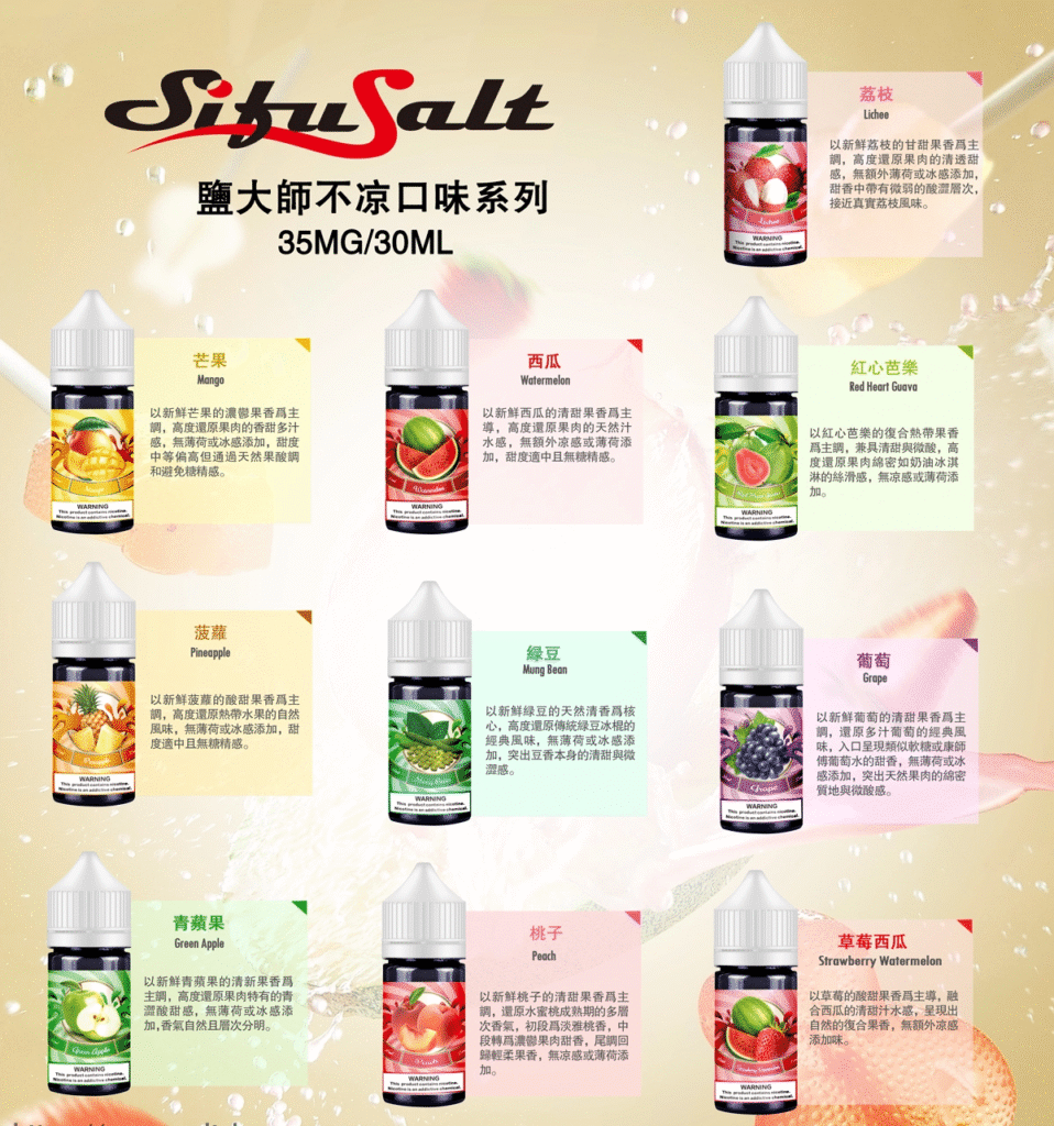 Sifu Salt煙油無涼版專為不愛涼感的煙友設計,讓您享受香氣與口感的純粹體驗。全系列精選10款人氣風味,完全去除冰涼刺激,保留濃郁香氣與順口煙霧,帶來更柔和、醇厚的吸食感受。採用高品質尼古丁鹽技術,迅速滿足菸癮需求,同時降低喉嚨刺激感,讓每一口都順滑細膩、不刮喉。無論您偏愛果香、煙草還是甜香系,四福鹽大師都能讓您找到專屬的味道。